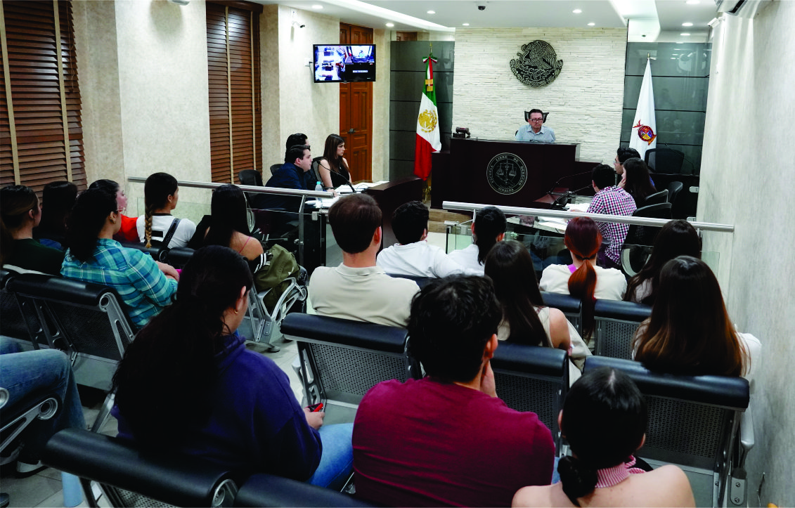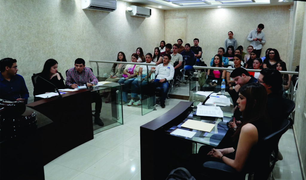 Estudiantes del grupo 2 de tercer grado, en la asignatura de Derecho Procesal Penal en el Sistema Acusatorio que imparte el Mtro. Óscar Mendoza Guerrero en la Escuela Libre de Derecho de Sinaloa, participaron en una sesión en la Sala para Práctica de Juicios Orales de nuestra Casa de Estudios.