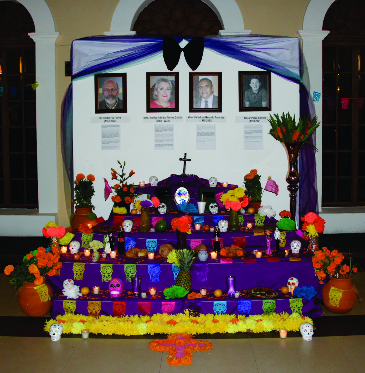 Por su parte, la joven Natalia Sofía Flores Durán, Presidenta de la Sociedad de Alumnos, dio lectura a las semblanzas del Dr. Héctor Fix Fierro, Mtra. Mónica Adriana Torres Galicia, Mtro. Heliodoro Gerardo Armenta y Oscar Pérez Carrillo, a quienes se les erigió este año el altar de Día de Muertos, con todos los elementos que marca la tradición.