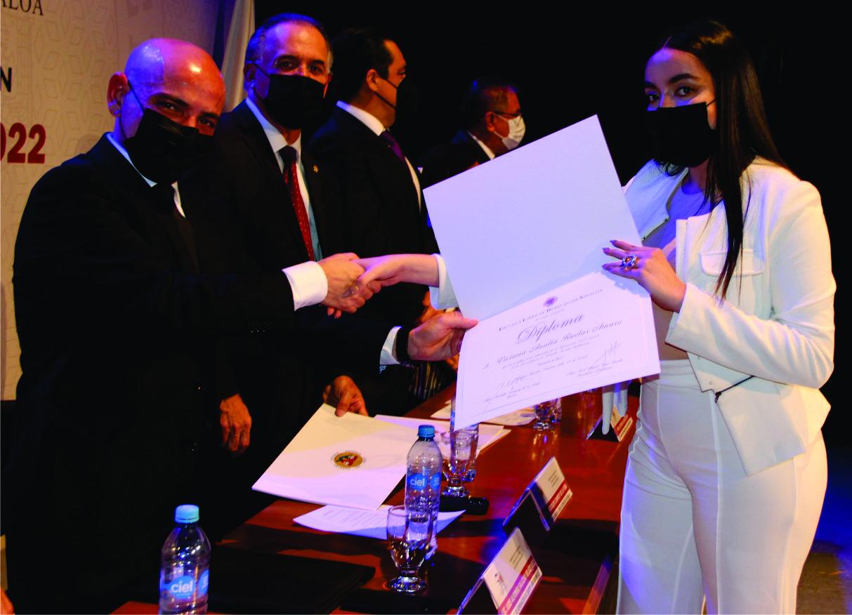 Parte relevante de este acto fue la entrega de Mención de Excelencia a Eugenia del Carmen Beltrán Guerra, como la mejor alumna de la Generación 2017-2022, por parte del Rector, y la indispensable foto del recuerdo con todas las y los Egresados, sus padrinos y autoridades.