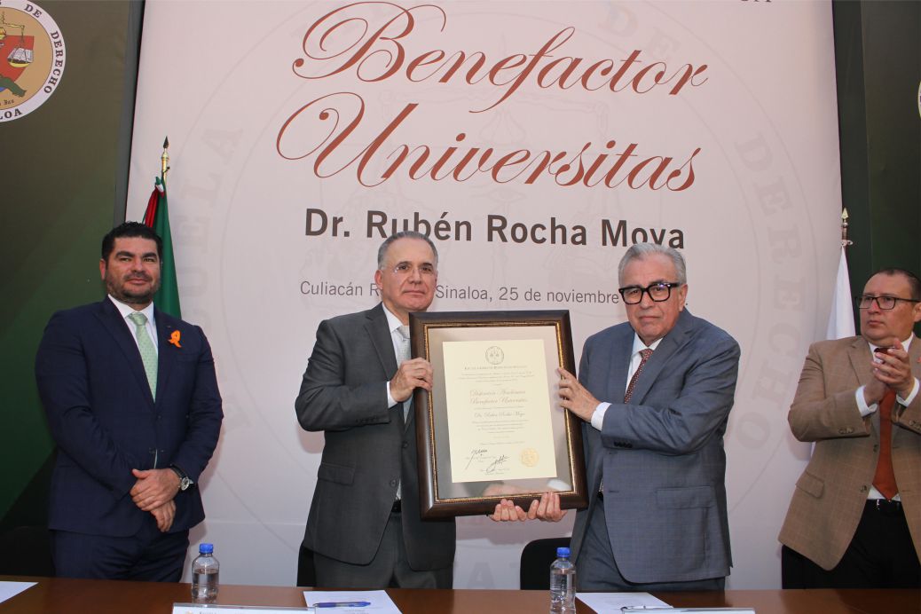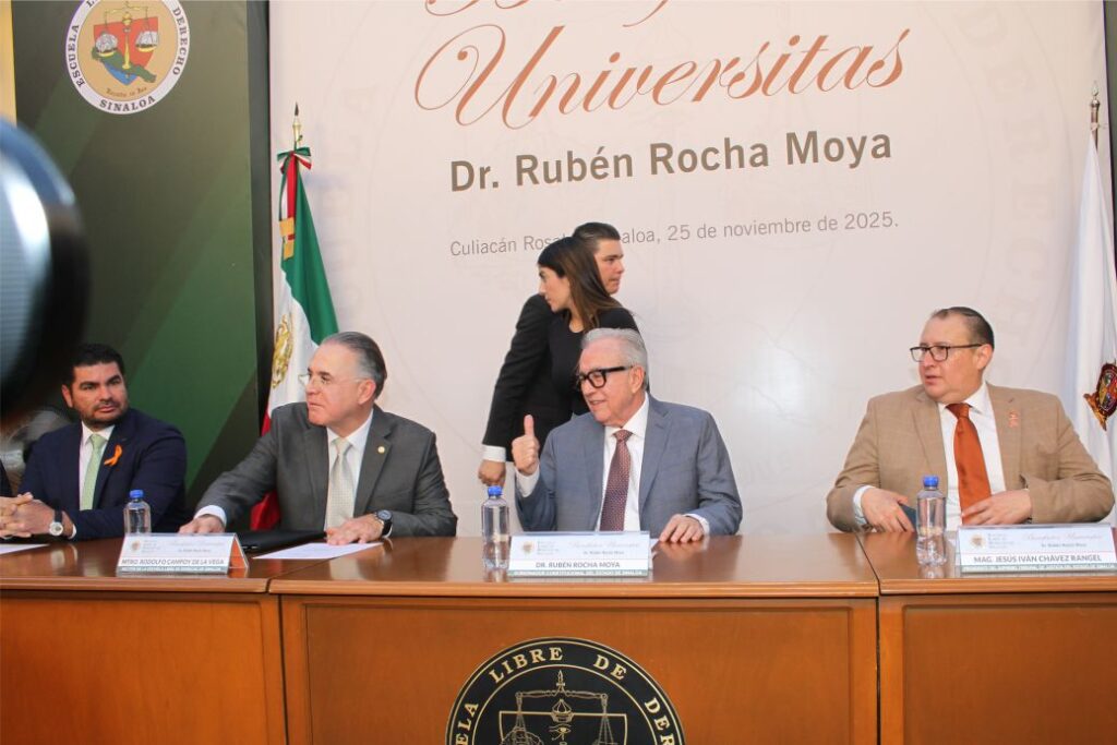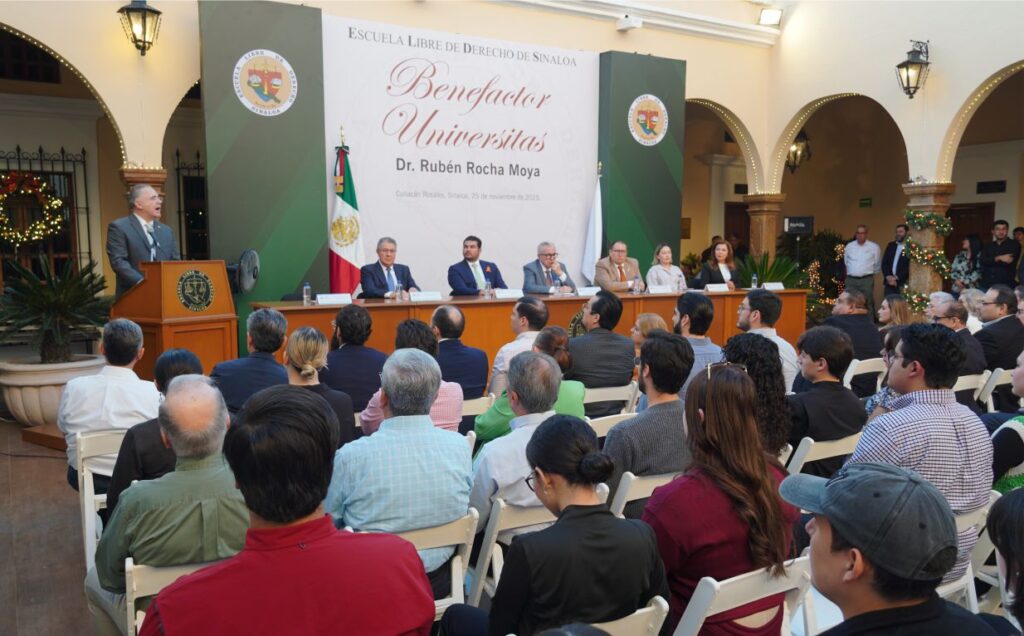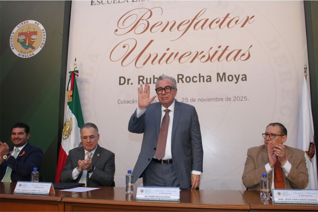 En un acto solemne que congregó a su comunidad, la Escuela Libre de Derecho de Sinaloa (ELDS) otorgó la distinción académica «Benefactor Universitas», al Dr. Rubén Rocha Moya, Gobernador del Estado de Sinaloa, en reconocimiento a su apoyo a la ELDS y a la educación en general.