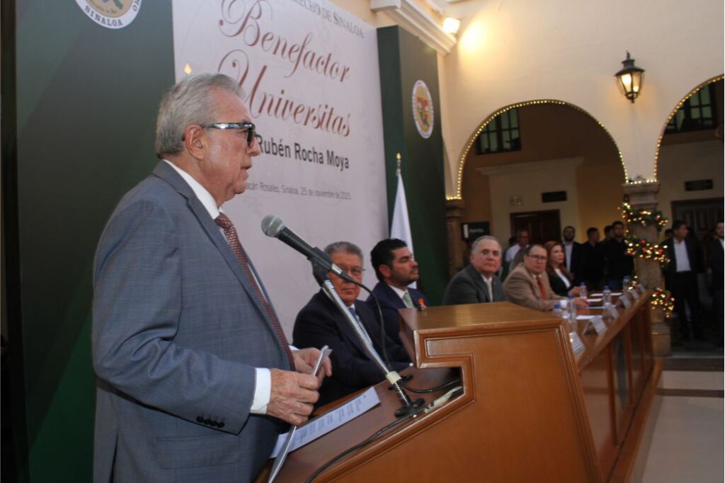«La presente distinción tiene como finalidad reconocer públicamente al Doctor Rubén Rocha Moya, Gobernador Constitucional del Estado, su generosidad y alto compromiso con nuestra Alma Mater,» afirmó Campoy de la Vega antes de hacer entrega oficial de la distinción”.