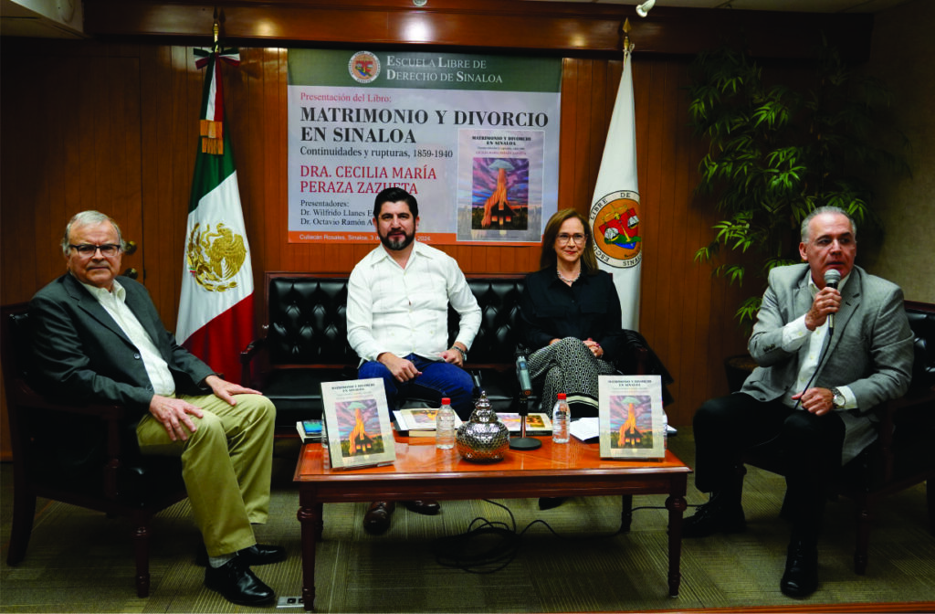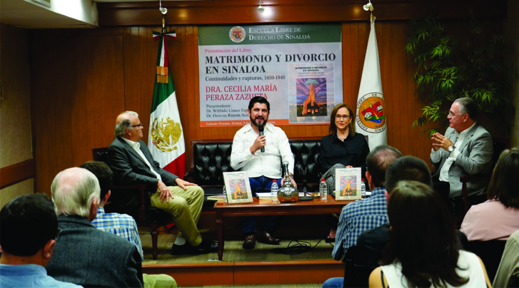 En el Salón de Directores de la Escuela Libre de Derecho de Sinaloa, fue presentado el libro “Matrimonio y divorcio en Sinaloa, continuidades y rupturas, 1859-1940”, de la Dra. Cecilia María Peraza Zazueta, quien dijo que este volumen es un estudio histórico sobre el matrimonio y divorcio civil en México, visto desde la particularidad de su implementación en Sinaloa.Se trata de un estudio histórico jurídico sobre el Matrimonio y Divorcio Civil, cuyo objeto es analizar su introducción y proceso de transformación a lo largo de ocho décadas, en el contexto de la construcción del Estado Mexicano, así como en las dimensiones jurisdiccionales que hoy llamamos conflictos de Derecho Familiar.En el ámbito de la formación de Profesionales en Derecho, el Libro constituye además un modelo alternativo de vanguardia, pues con una fina prosa atiende todas las dimensiones de la realidad jurídica: la norma, las instituciones, los valores y el poder, pues se escribe a partir de leyes, expedientes judiciales y eclesiásticos encuadrado en determinados contextos socioeconómicos y políticos, todo lo cual dota al libro de un valor extraordinario.En el acto de presentación acompañaron a la autora, el Dr. Octavio Ramón Acedo Quezada, docente e investigador de nuestra Casa de Estudios; el Dr. Wilfrido Llanes Espinoza, docente de la Facultad de Historia de la UAS y, como moderador, el Mtro., Rodolfo Campoy de la Vega, Rector de la ELDS.La autora es profesora de Derecho Romano y de Historia del Derecho Mexicano en la ELDS e investigadora del Centro de Investigaciones Jurídicas de nuestra Escuela y este libro, dijo, tiene su origen en la tesis con que se graduó como Doctora en Historia por la Universidad Autónoma de Sinaloa, y es un estudio que abarca ocho décadas, cuyo telón de fondo es la historia de la construcción del Estado.Durante casi tres décadas, Peraza Zazueta se ha desempeñado como traductora con especialidad en textos jurídicos, y sus principales intereses investigativos son la Historia del Derecho, de la justicia y de las relaciones Iglesia-Estado.Por su parte, el Dr. en Derecho Octavio Ramón Acedo Quezada es profesor de las materias Teoría del Delito y Filosofía del Derecho en la ELDS en donde además dirige el Centro de Investigaciones Jurídicas. Conferencista y autor de múltiples artículos y productos de investigación en revistas de prestigio nacional e internacional, autor de diversos libros sobre temas jurídicos, y miembro activo de la Barra Mexicana Colegio de Abogados, Capítulo Sinaloa. Actualmente ejerce la abogacía en el ámbito del litigio bancario y el derecho penal patrimonial.El Dr. Wilfrido Llanes Espinoza, a su vez, es desde 2008 profesor e investigador de Tiempo Completo en la Facultad de Historia de la UAS, y ha sido reconocido con el perfil deseable por la Dirección de Fortalecimiento Institucional de la SEP y fue miembro del Sistema Nacional de Investigadores de 2012 a 2019, con dos libros en su haber.